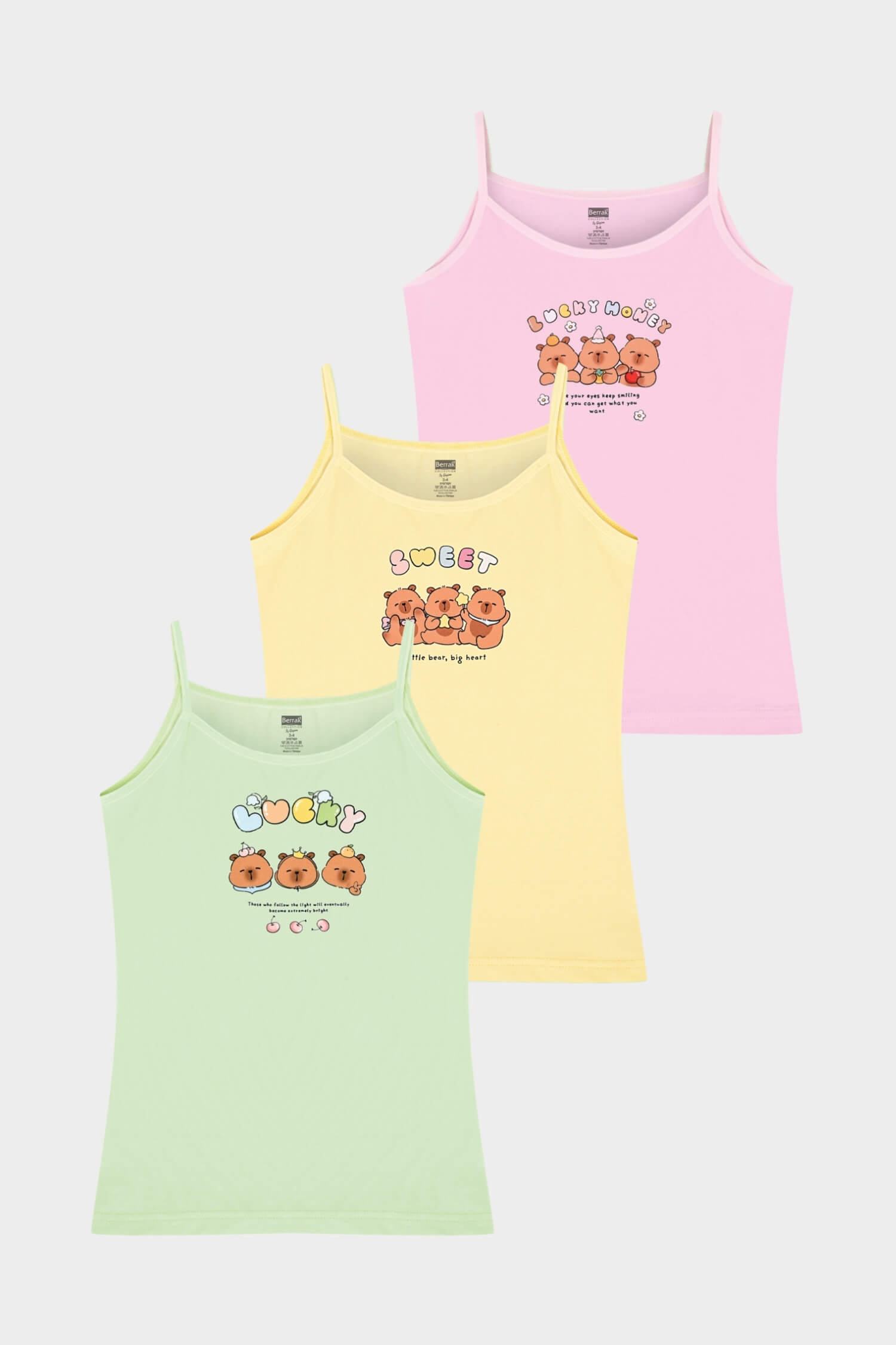 Kız çocukları için özel olarak tasarlanan bu 3’lü askılı atlet seti, gün boyu konfor ve şıklığı bir arada sunar. %95 pamuk, %5 elastan kumaş içeriği sayesinde yumuşak dokulu, nefes alabilen ve esnek bir yapıdadır. Hassas çocuk ciltleriyle uyumlu olup terleme yapmaz.